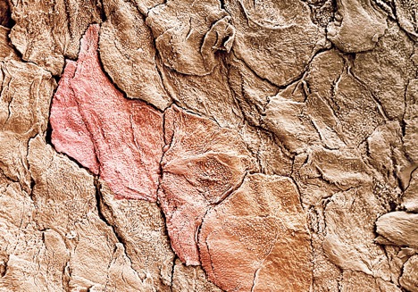 Ảnh hiển vi điện tử quét tăng cường màu (SEM) của lớp ngoài cùng của da người : biểu bì.- Nguồn hình sciencephoto.com