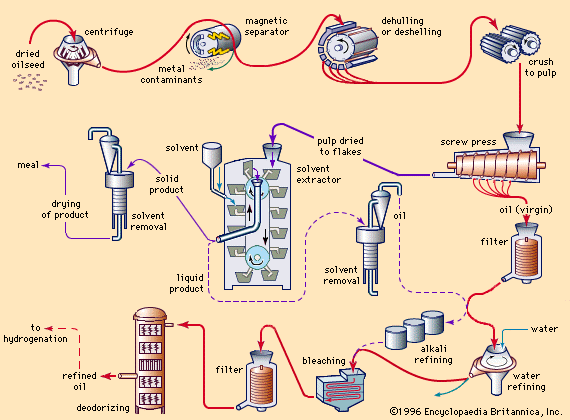 - Trích ly dầu và loại bỏ nước: Sau khi nguyên liệu chứa chất béo đã được xay, nghiền nhỏ thì thêm vào đó các dung môi thường là 1 hydrocacbon dễ bay hơi như xăng, hecxan, dicloetan, nhưng phổ biến nhất là hecxan. Sau đó, người ta thu hồi lại dầu bằng cách chưng cất dung môi, cho dung môi này bay ra ngoài. 90% dung môi tách ra ngoài bằng cách bay hơi, phần còn lại cho thêm nước vào để đun sôi, phần hecxan còn lại sẽ bay hết ra khỏi dầu.