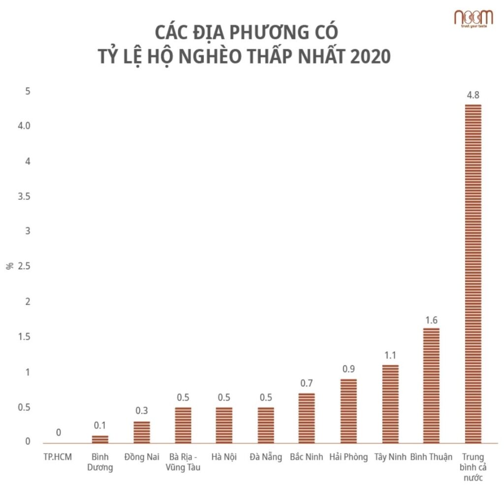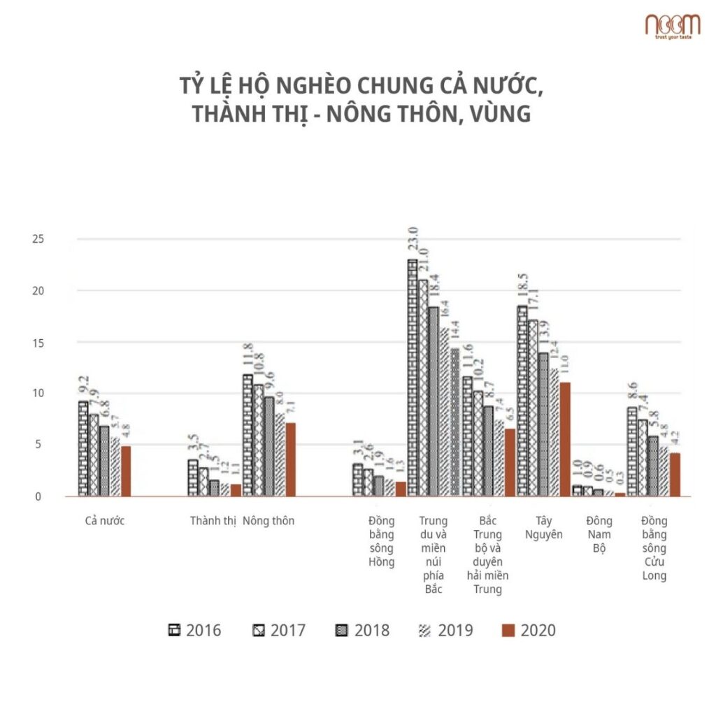 Xét trên từng khu vực, tỷ lệ hộ nghèo có sự khác biệt giữa các vùng. Năm 2020, con số này ở nông thôn là 7,1%, cao hơn nhiều ở khu vực thành thị là 1,1%. Vùng Trung du và miền núi phía Bắc có tỷ lệ hộ nghèo cao nhất (14,4%), tiếp đến là các vùng Tây Nguyên, Bắc Trung Bộ và Duyên hải miền Trung (11% và 6,5%). Vùng có tỷ lệ hộ nghèo tiếp cận đa chiều thấp nhất là Đông Nam Bộ (0,3%).