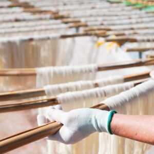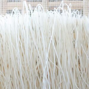 Sạc gạo > Ngâm > Xay nước > Tách bột tự động bằng máy > Ép bún > Giũ bún > Phơi.