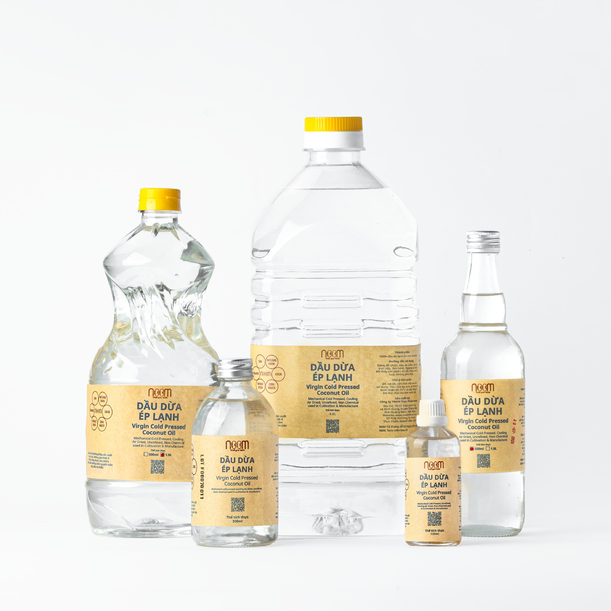 100% dầu ép lạnh từ cơm dừa tươi, dầu nguyên chất, ép lạnh cơ học, không tinh luyện.