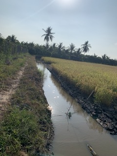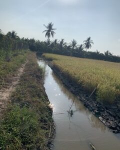 - Ruộng có mương nước đệm đang nuôi tôm cá => Tôm là vật nuôi rất nhạy cảm với nguồn nước bị nhiễm hoá học, chỉ có nguồn nước sạch tôm mới sống được
