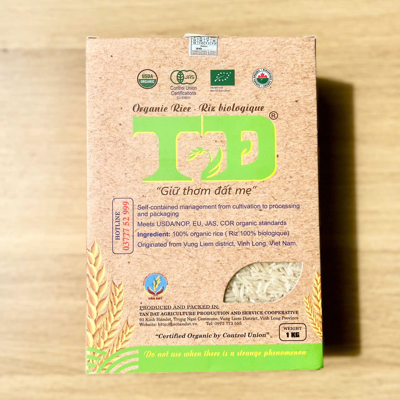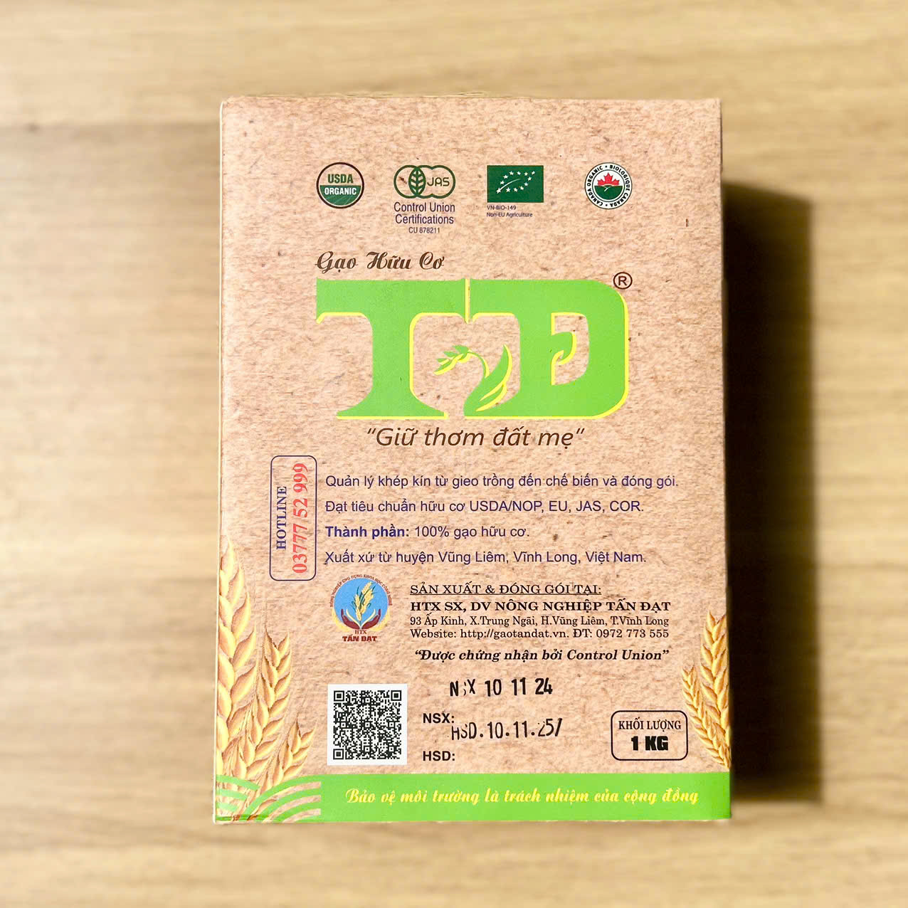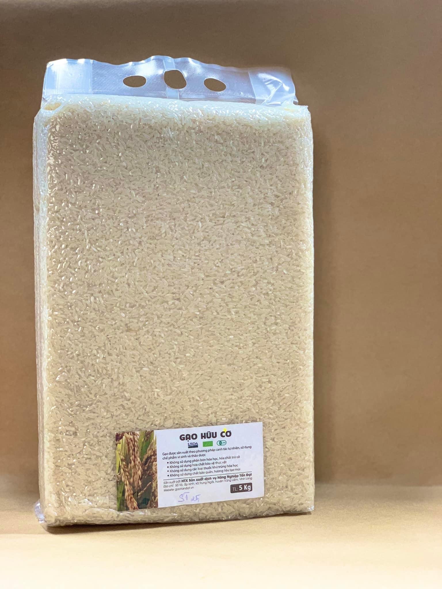 Quy trình: Sản xuất và đóng gói theo quy trình sản xuất gạo hữu cơ khép kín tại HTX SX, DV nông nghiệp Tấn Đạt, là loại gạo sau khi tách và thổi sạch trấu thì được đưa vào máy để cà nhẹ một lớp cám bên ngoài. Điều này giúp hạt gạo giữ lại được lớp vỏ cám quý giá giàu dinh dưỡng giàu vitamin nhóm B có khả năng chống oxy hóa,