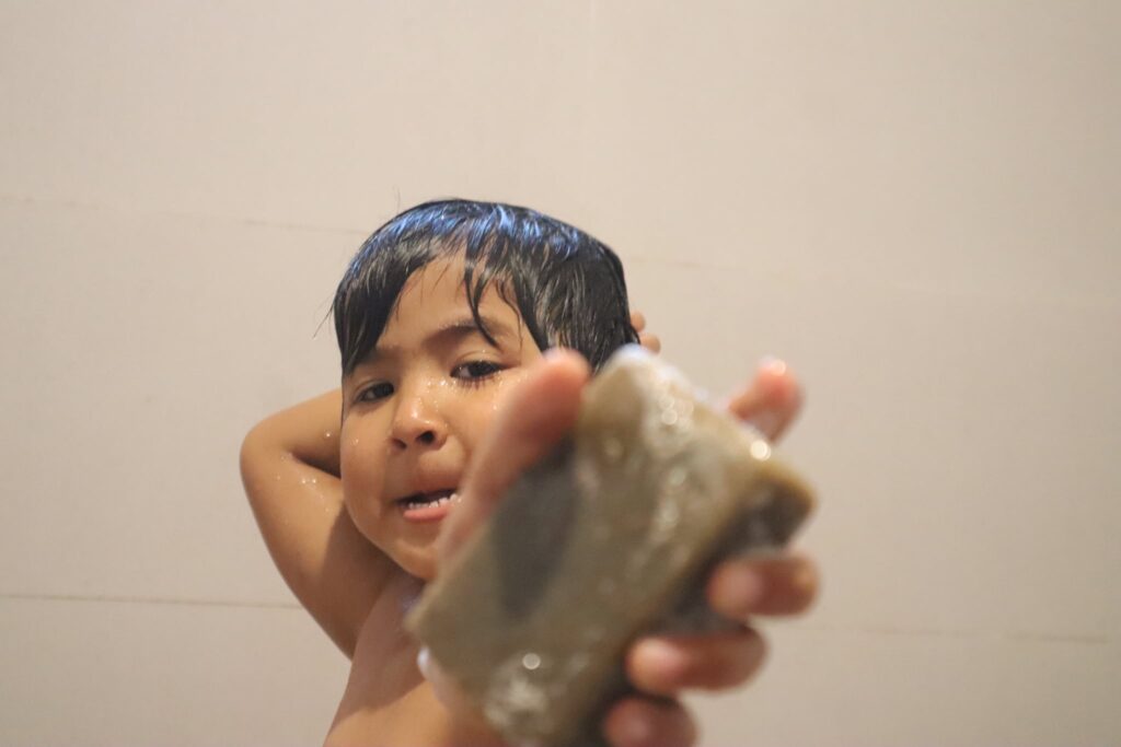 Lưu ý khi dùng xà bông để tắm, gội cho trẻ nhỏ thì không được để xà bông vào mắt trẻ. Đối với trẻ sơ sinh trẻ nhỏ dưới 2 tuổi bố mẹ cầm cục xà bông lắc vào trong chậu nước tắm 1 lượng tí vào nước để tắm cho trẻ, không chà cục xà bông trực tiếp lên da trẻ. Có thể nhỏ vào chậu nước tắm cho bé vài giọt tinh dầu tràm để tăng đề kháng da cho trẻ. Sau khi tắm xong thì tắm tráng lại nước sạch.