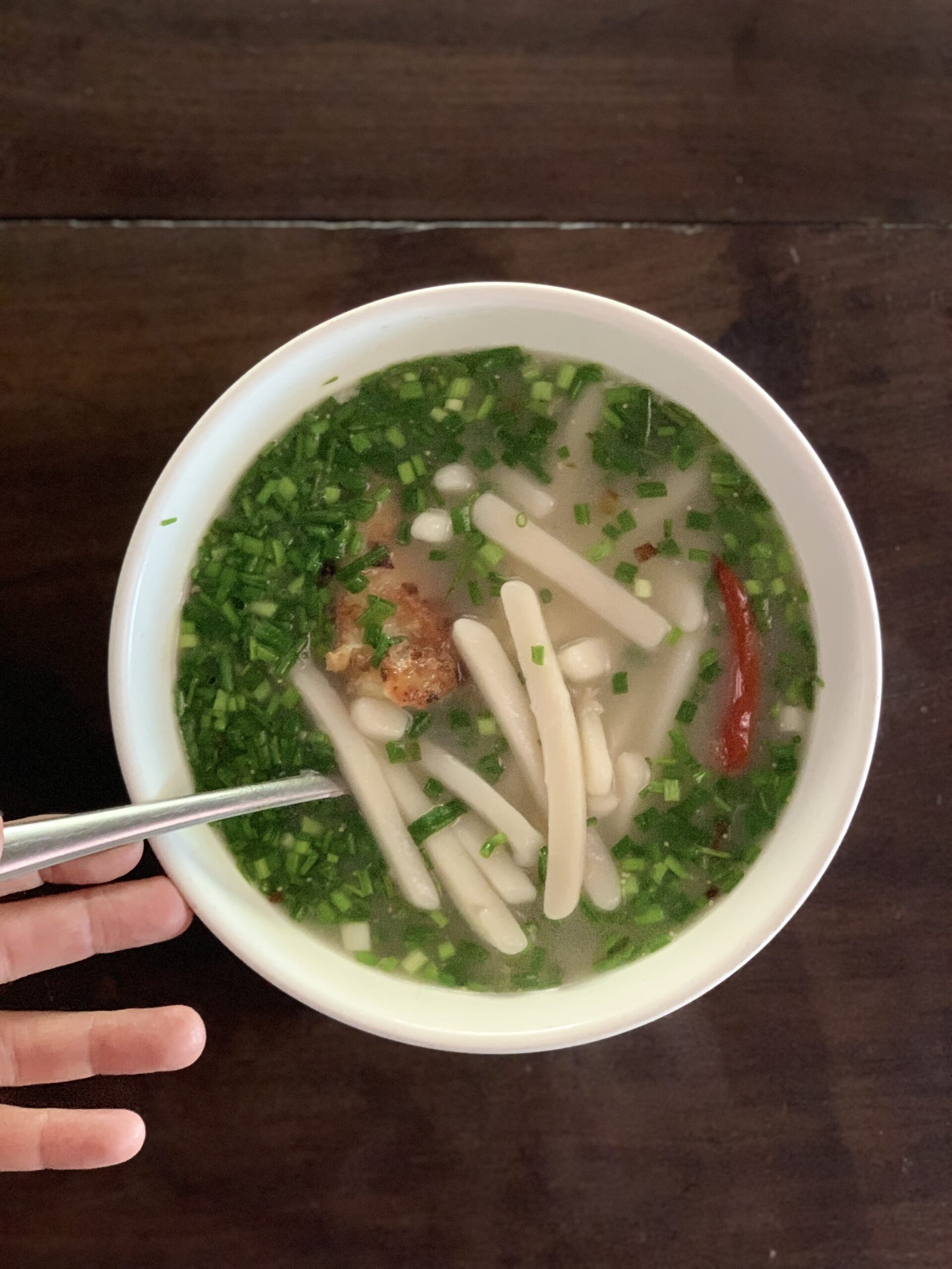 – Dùng đũa hoặc muống khuấy đều cho đến khi sôi, để sôi khoảng 5 phút cho bột chín.