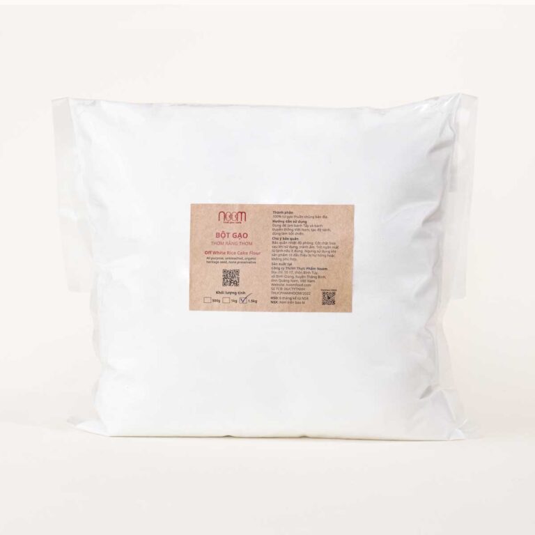 Bột gạo đa dụng Thơm Rằng Thơm là 100% bột gạo từ 2 giống lúa tẻ thuần chủng trứ danh đất Quảng, được trồng theo phương pháp vườn rừng bền vững tại farm Rơm Vàng của Noom.