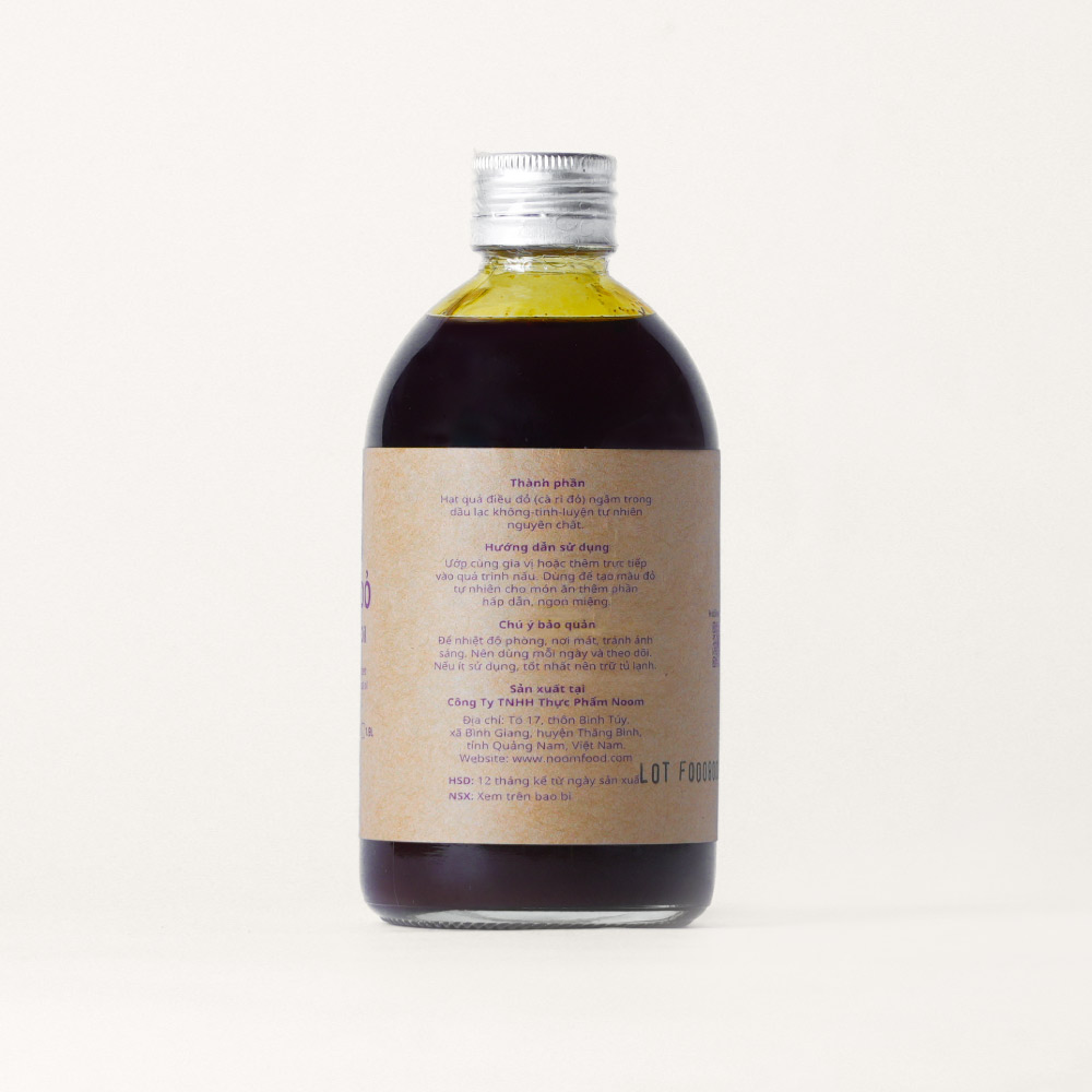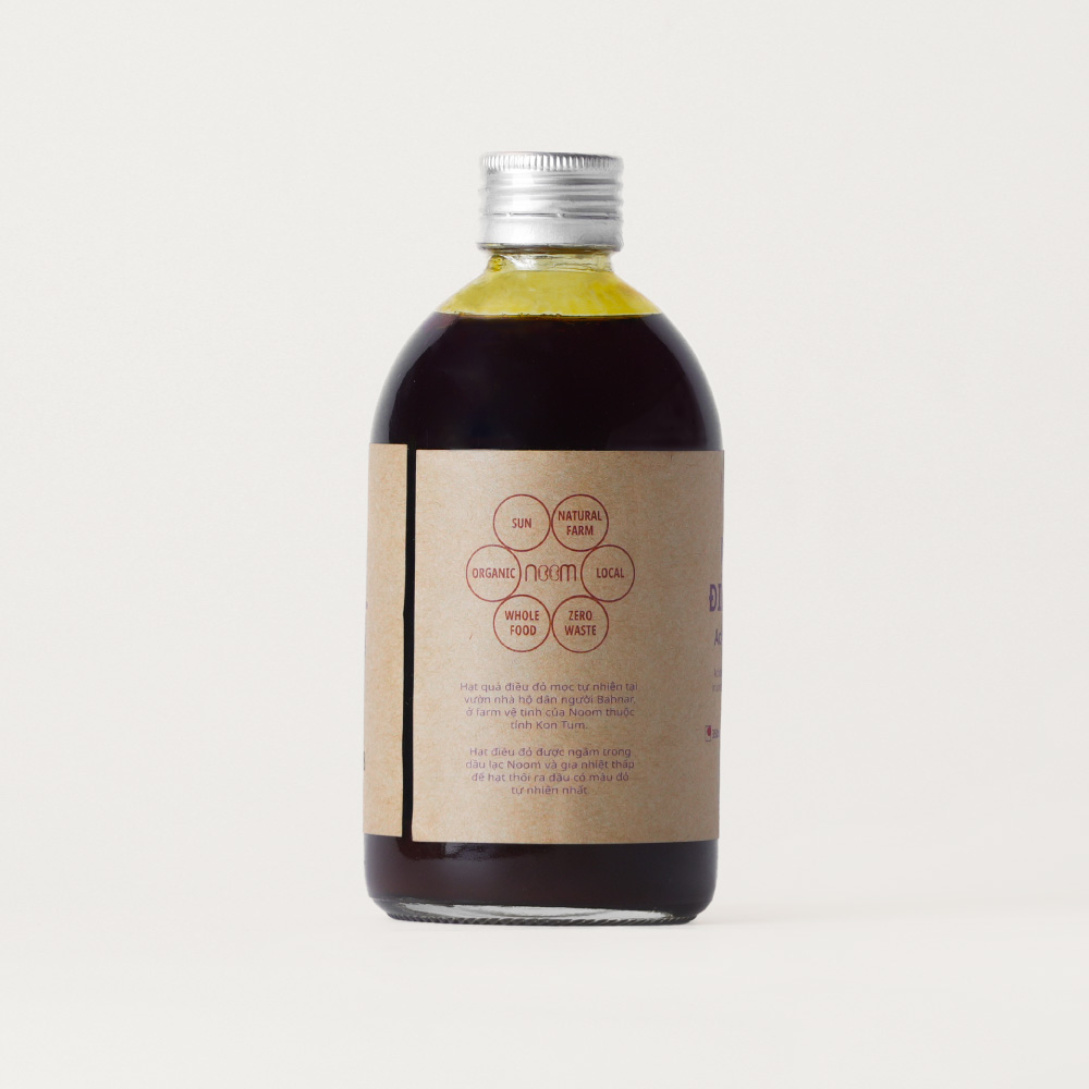Dầu điều đỏ noom được làm từ hạt quả điều đỏ mọc tự nhiên tại vườn nhà hộ dân người Bahnar, ở farm vệ tinh của noom thuộc tỉnh Kon Tum, được ngâm trong dầu lạc noom và gia nhiệt thấp để hạt thôi ra dầu có màu đỏ tự nhiên nhất.